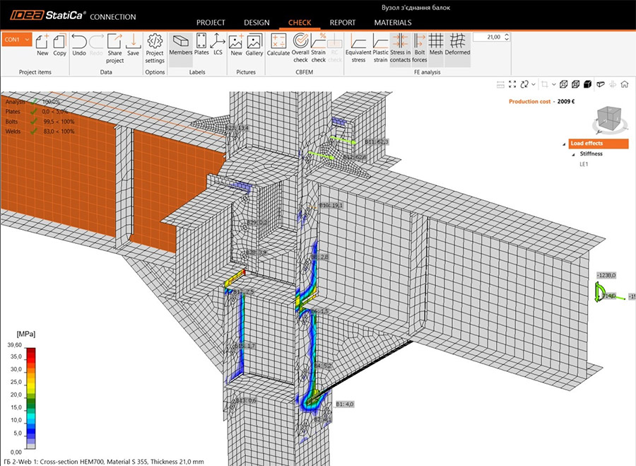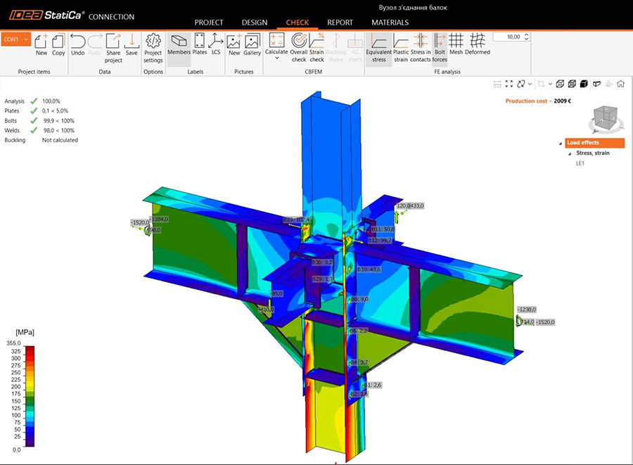 Головні переваги IDEA StatiCa для проєктувальників металевих конструкцій — це зручність у роботі, інтеграція з іншими програмними комплексами та можливість виконувати спеціальні розрахунки жорсткості вузлів, міцності компонентів, напружень і деформацій, що значно підвищує точність і ефективність проєктування.